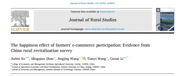 近日,我院青年教师许佳彬在国际知名期刊《Journal of Rural Studies》(IF=5.7,中科院SSCI一区Top,ABS三星期刊)正式发表了“The happiness effect of farmers’e-commerce participation: Evidence from China rural revitalization survey”研究论文,揭示了农民电商参与对幸福感的影响机制。我校兼职教授李翠霞为该论文通讯作者,我校为第一署名单位。
