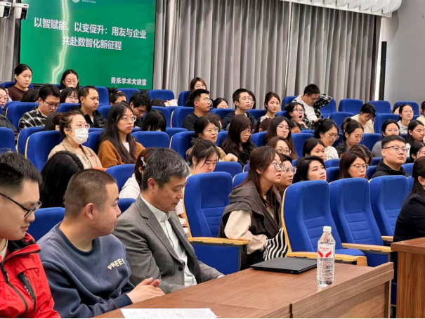 2025年9月25日上午,东北农业大学经济管理学院会计学科“青禾学术大讲堂”在成栋楼13层大数据与智能商务报告厅举办。讲座特邀两位来自用友集团体系的资深专家——黑龙江用友网络科技有限公司副总经理李峰涛与新道科技黑龙江分公司市场总监吴雪凌联袂主讲,两位专家分别围绕“AI引航数智升级,新技术激活全场景”和“从本土软件到全球服务商——用友的数字化转型与发展征程”两大主题展开了深度分享。全体会计与金融专业硕士研究生近150人到场学习,本次讲座由经济管理学院温薇教授主持。